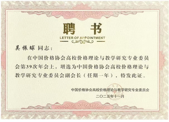 吴振球教授此次被增选为专业委员会副会长,既是学术界对其个人近二十年来在价格研究与教学领域所作贡献的充分肯定,也彰显了我院在价格理论研究领域的学术影响力。
