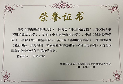 12月13日,全国国际商务教育指导委员会示范教学案例总结会暨第三届国际商务教学案例开发与应用研讨会在北京第二外国语学院朝阳校区竞先厅召开。会上,全国国际商务专业学位研究生教育指导委员会公布了第三届国际商务专业学位示范教学案例入库评选结果,我院曹亮教授团队开发的《瓷行四海,风起潮州:松发陶瓷的非遗创新与品牌出海实践》和田毕飞教授团队开发的《离舟筑舰:盛隆电气“质”造全球》两篇案例获评示范教学案例。