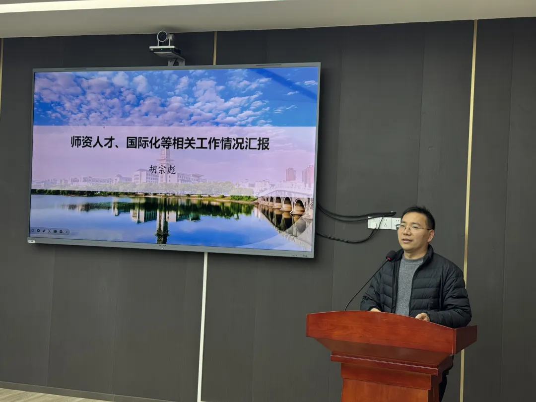 胡宗彪围绕人才师资与国际化工作展开汇报。他介绍了学院目前师资队伍现状,指出当前存在规模有待扩大、性别与年龄结构需优化、学缘国际化程度不足等问题,并提出加大青年教师与海归人才引进力度等针对性举措。国际化工作方面,将推动国际贸易本科专业国际班立项,深化国际合作,助力人才培养国际化水平提升。