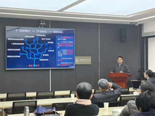 在第一场讲座中,张寅副处长围绕海南自由贸易港政策制度体系展开阐述。从“什么是自由贸易港”“为什么是海南”等问题出发,深入解读了建设海南自贸港的政策背景和战略意义。他结合全程参与自贸港封关运作的实践经验,通过具体案例和数据解释了“一线放开、二线管住、岛内自由”的实际运作逻辑,并详细介绍了零关税、放宽贸易管理、加工增值、免税购物等具体举措,让在场师生清晰把握了自贸港建设的核心框架与推进路径。