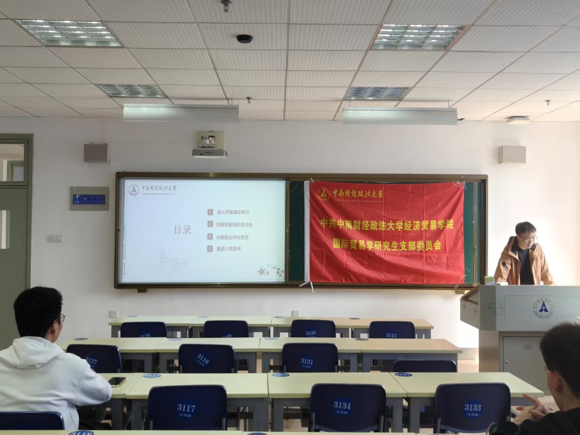 (通讯员:谢兰涛、左泽桦)为深入学习贯彻习近平新时代中国特色社会主义思想和党的二十届四中全会精神,锲而不舍落实中央八项规定精神,持续推进作风建设常态化长效化,2026年3月10日,国际贸易学研究生党支部召开主题党日活动,同步开展组织生活会、民主评议党员等系列工作,推动党建工作与研究生科研学习深度融合,筑牢青年党员思想根基。学院党委副书记左思出席活动并讲话,支部全体党员参加会议,党支部书记刘恒睿主持本次活动。