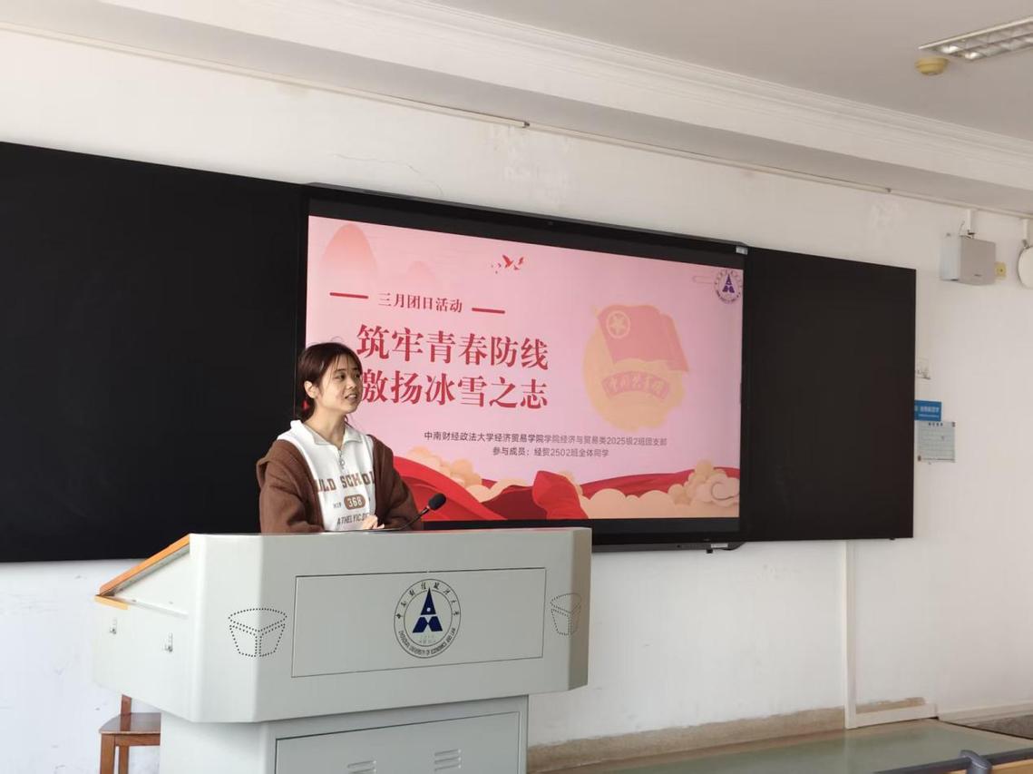 (通讯员 黄祖怡嘉)为加强青年思想引领,培育新时代青年法治素养、文化自信与奋斗精神,经贸2502团支部于3月25日下午在文津楼404开展“筑牢青春防线,激扬冰雪之志”3月团日活动。经贸2502全体同学参与本次活动。