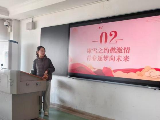 冬奥精神学习环节,副班长刘思言同学展示冬奥会开幕式场景、中国健儿的赛场高光瞬间,让同学们沉浸式感受冰雪运动的魅力,带领大家深入学习冬奥精神,引导团员青年将冬奥精神转化为成长动力,以奋斗姿态勇担时代使命。